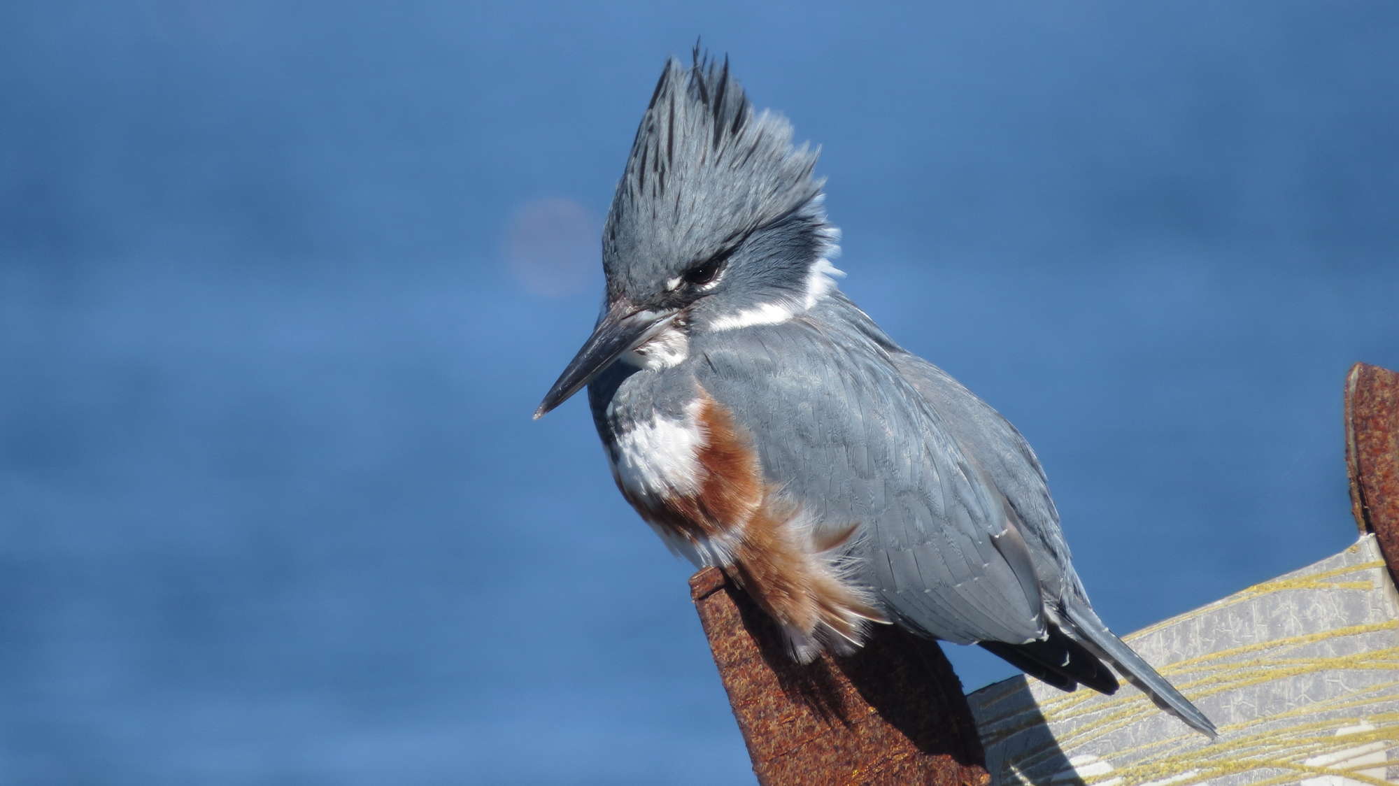 Some day I’d like to see grebes in their breeding plumage so they can really wow me. Speaking of wows, while walking along the pier we got the best looks ever of this Belted Kingfisher.